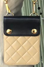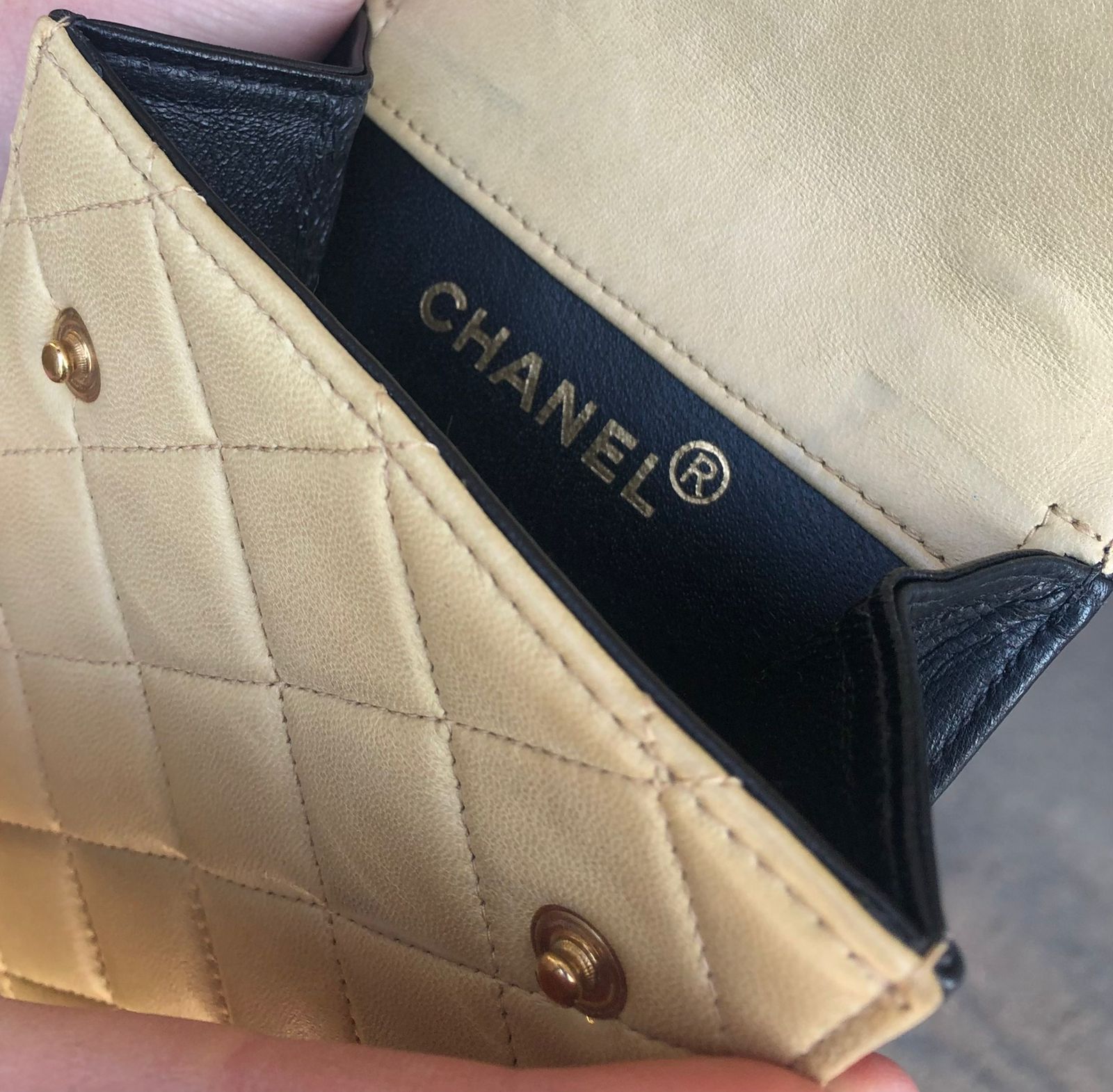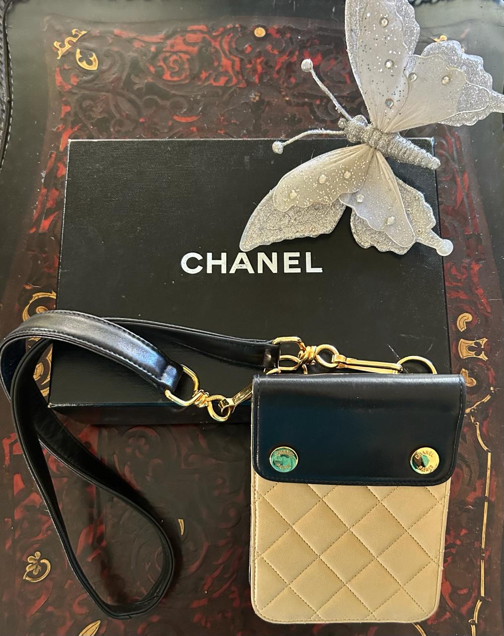 Fabulous petite “CHANEL” shoulder bag in navy and beige with original box in navy and beige lamb skin leather