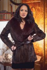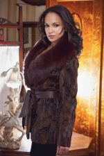 Elegant Brown Swakara Fur Jacket With Rust Fox Fur Collar And Brown Leather Belt